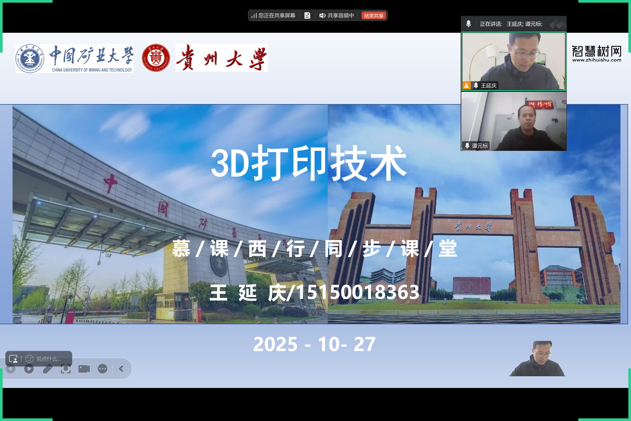 今年正值“东西课程联盟”成立12周年,其中“慕课西行”是“东西课程联盟”重要举措。为积极响应教育部“慕课西行”实施计划,推动优质教学资源开放共享,10月27日14:30-16:20,材料与物理学院的王延庆老师在材料楼B203-2室,通过智慧树平台与贵州大学材料与冶金学院的师生展开跨校远程同步课堂,讲授了一堂《3D打印技术》课程。