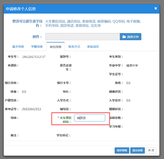 如实填写距离家庭地址最近的火车站站点名称,但不要写“站”字,例如“南京南”或“南京”,不要填写“站”字。详细火车站站名请参照附件《火车站名字典》“站名”栏填写,如站名填写错误,将无法购买学生优惠票。如学生家庭地址是江苏省徐州市区,默认没有火车票优惠卡。