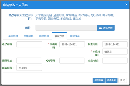 电子邮箱、手机号码、固定电话、家庭地址、家庭电话、通讯地址、QQ号码、邮政编码。请务必本着对自己高度负责的态度如实填写。手机号码和家庭地址为必填。家庭地址的填写格式参照: