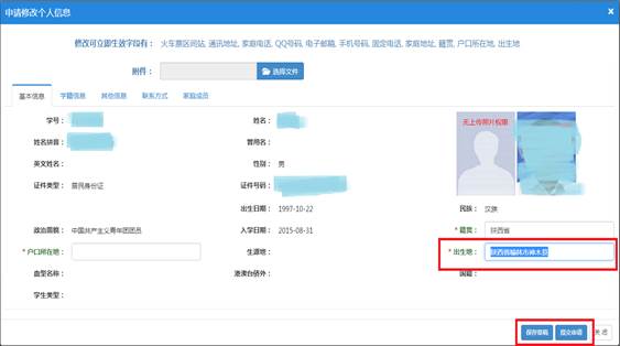 2、出生地信息:出生地为新版学士学位证书新增加的信息,请认真核对此项信息。目前教务系统中有部分学生的出生地信息为空,请务必准确填写出生地信息,出生地格式请参照“XX省XX市”或是“XX省XX市XX县”,并且保存提交,见下图。