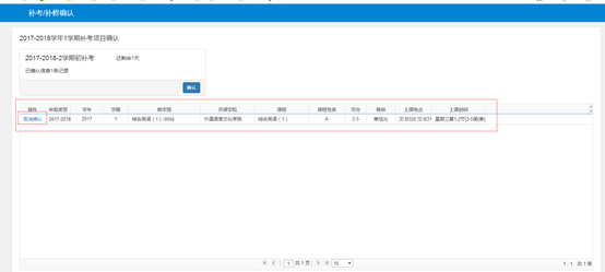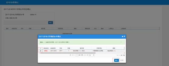 4、在列出可确认的统一补考课程中选择“操作”列中打√,最后,点击【确定】按钮提交确认操作。