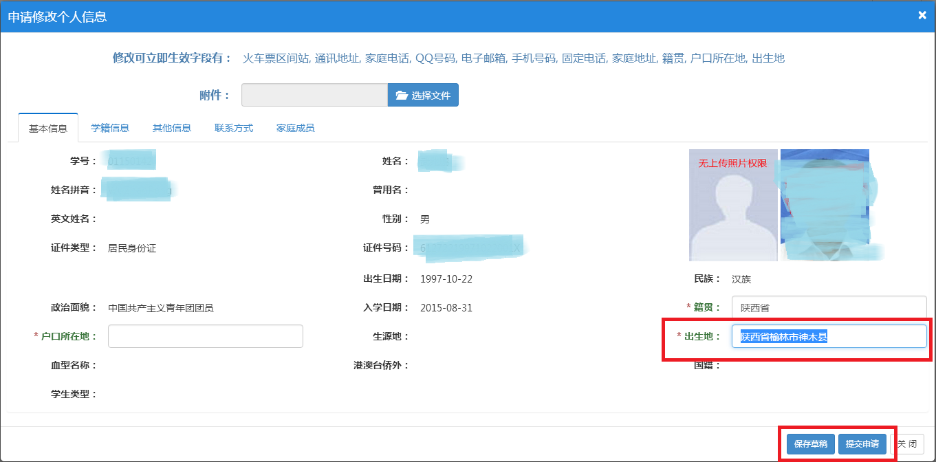 2、出生地信息:出生地为新版学士学位证书新增加的信息,请认真核对此项信息。目前教务系统中有部分学生的出生地信息为空,请务必准确填写出生地信息,出生地格式请参照“XX省XX市”或是“XX省XX市XX县”,并且保存提交,见下图。