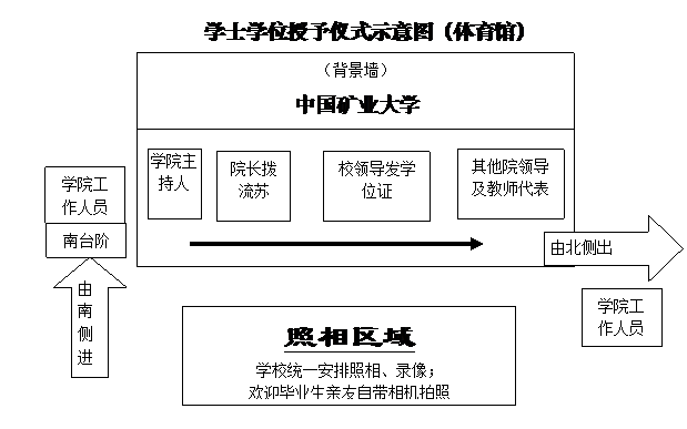 1.教务部负责人请学位授予人(校领导)、院长及学院主持人(教学副院长)入场,校领导站主席台前正中位置,院长和学院主持人站在侧边位置(见示意图);