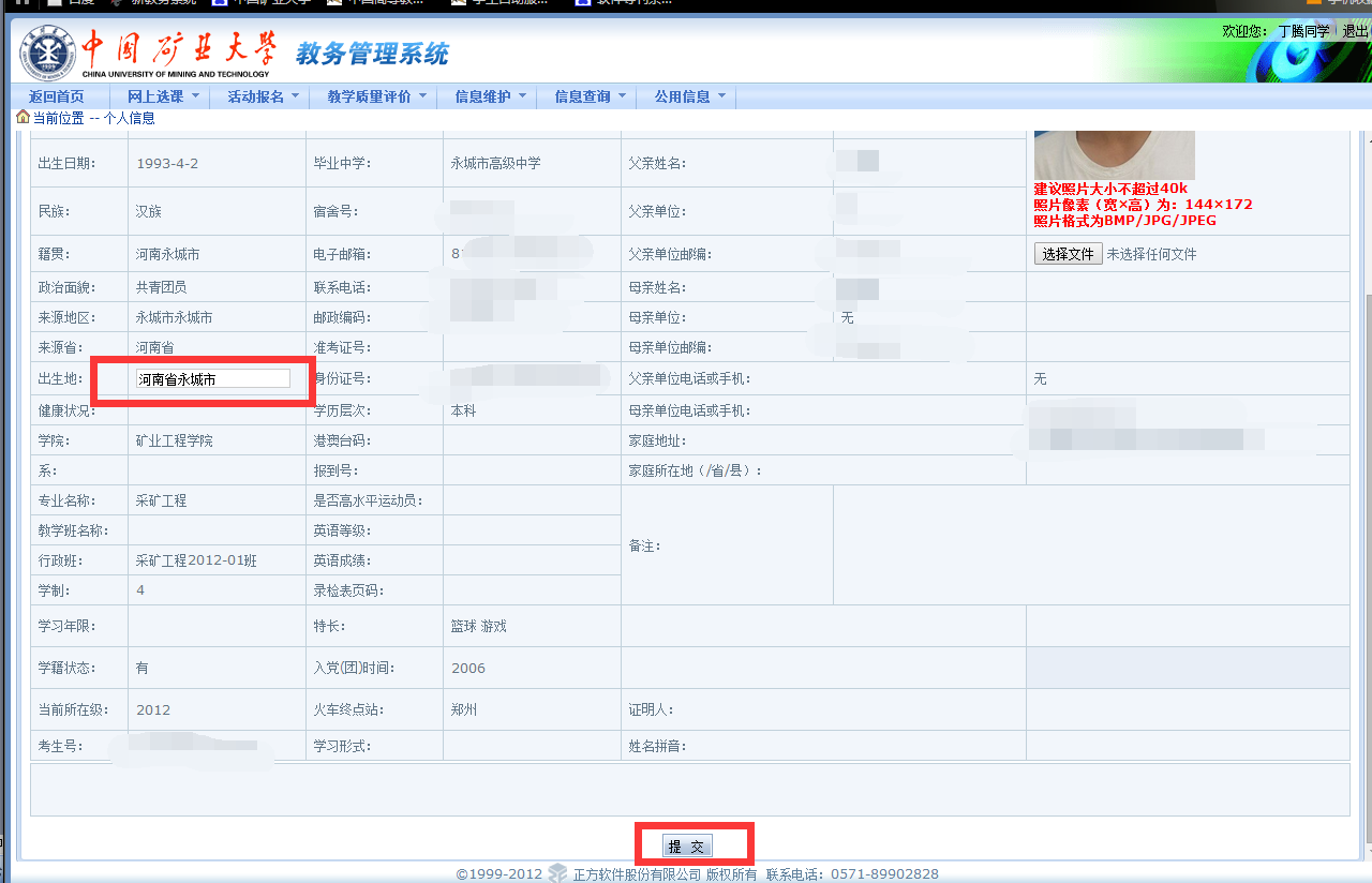 2、出生地信息:出生地为新版学士学位证书新增加的信息,请认真核对此项信息。目前教务系统中有部分学生的出生地信息为空,请务必准确填写出生地信息,出生地格式请参照“XX省XX市”或是“XX省XX市XX县”,并且保存提交,见下图。